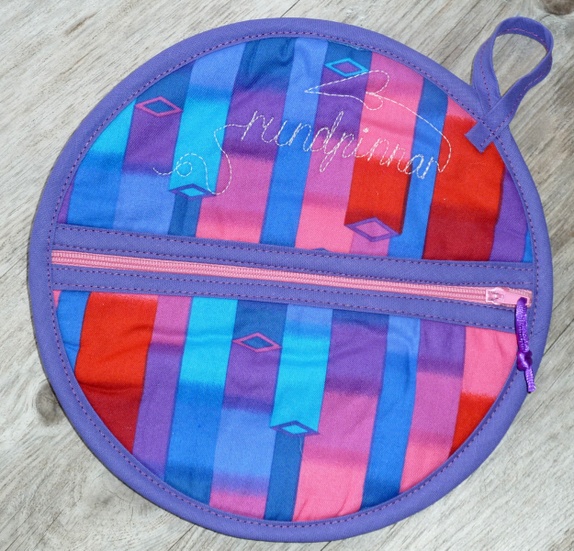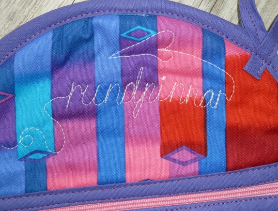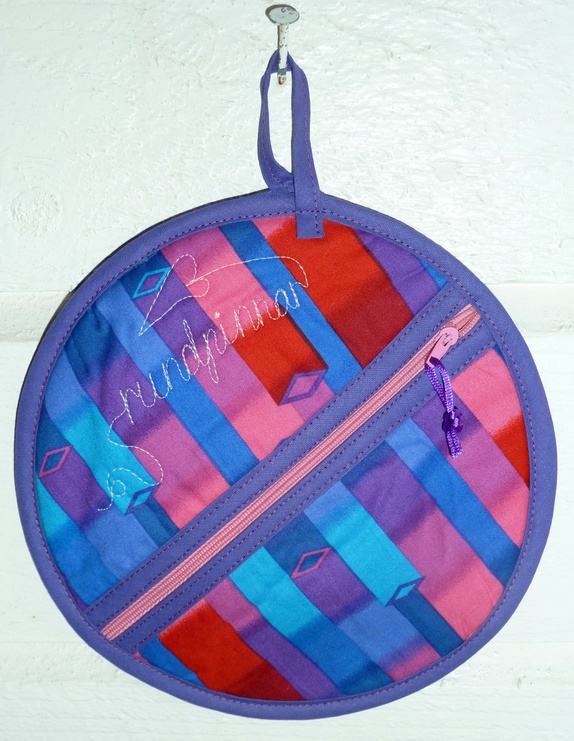 Rundpinne-etui laga i bomullsstoff. Etuiet er vattert og fora.Glidelåslukking.Skråband rundt og hempe slik at du kan henge det opp."Rundpinnar" er frihandsbrodert på.