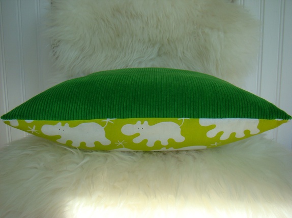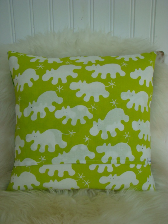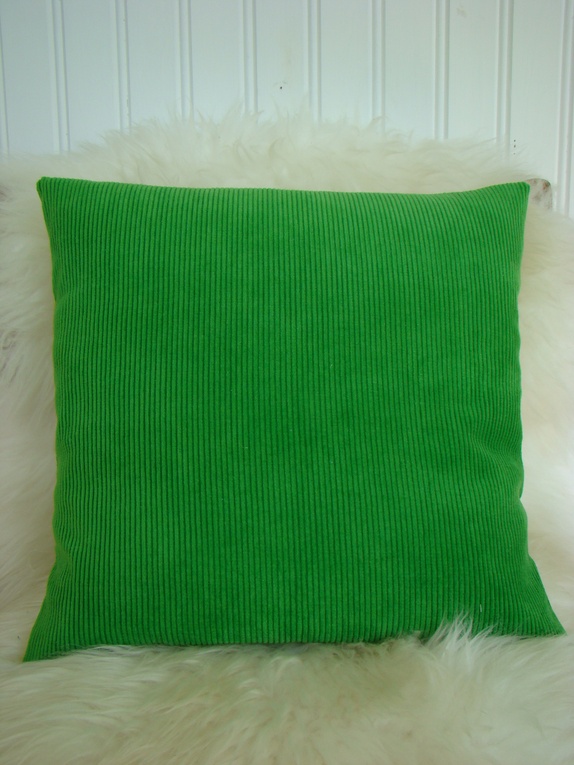 Pute sydd av eplegrønn kordfløyel. Bakside i grønt bomullsstoff med hvite flodhester og konvoluttåpning. Passer til innerpute 40 x 40 cm, men denne følger ikke med.