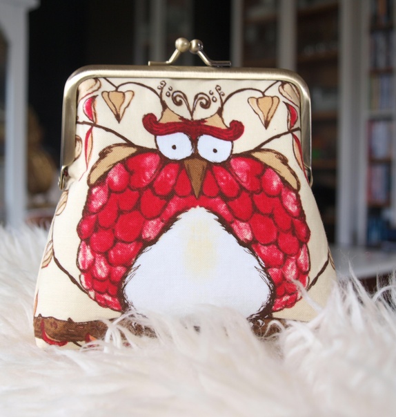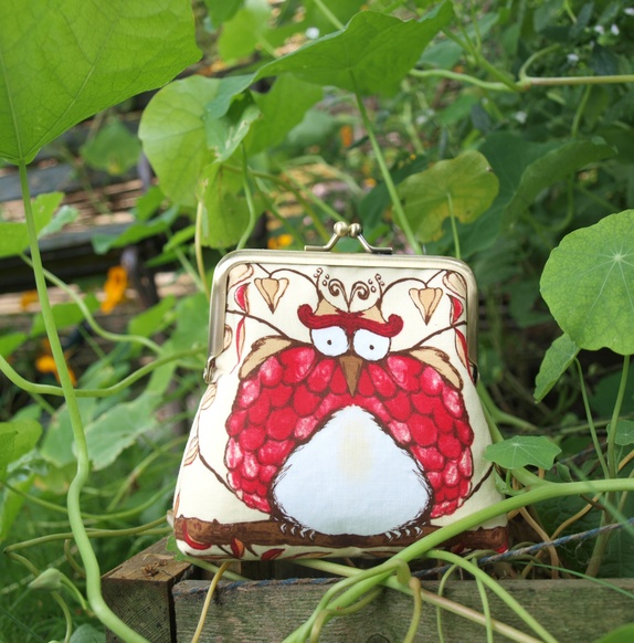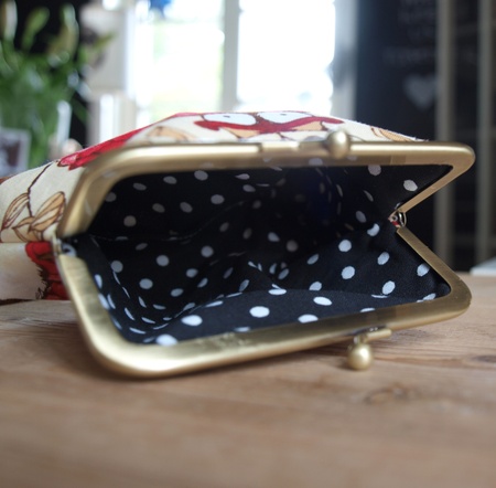 Portemone sydd stoffdesign;Tina Givens.Samme motiv på begge sider.Foret med sort/hvitt bomullstoff,vliselin mellom lagene.Veskelås av messing, måler 10,2 cm.Portemone målerpå det bredeste: 12 cmhøyde : 13 cm