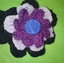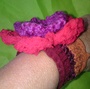 Blomst i mange rødnyanser med trefarget håndleddsbånd laget av strømpebukser og BH, blomst i rødt og cerice laget av nettingstrømper og bouclègarn. Flott gammel blomsterformet messingknapp med blomstermønster