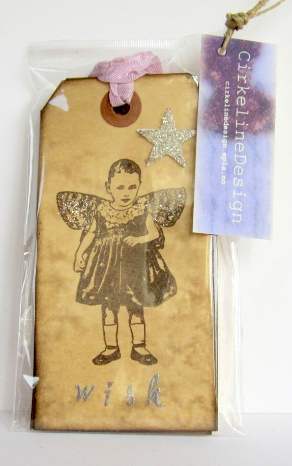 Manilalappene er badet i kaffe og svertet i kantene for en "vintage look". Motivet er en håndstemplet liten pike med glitrende, lilla englevinger, samt en stjerne med sølv glassglitter. "Wish" er embosset (forhøyet stempling) i sølv. På baksiden er det stemplet "Til" og "Fra", og det er plass til å skrive en personlig hilsen. Lys lilla sløyfebånd hører med.