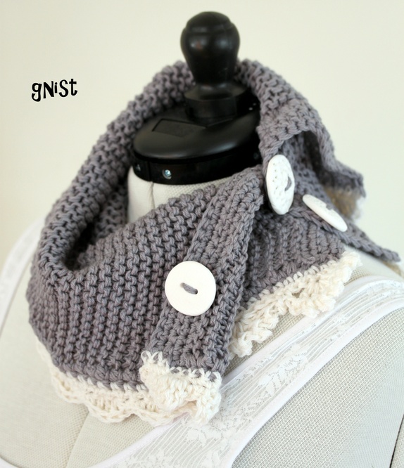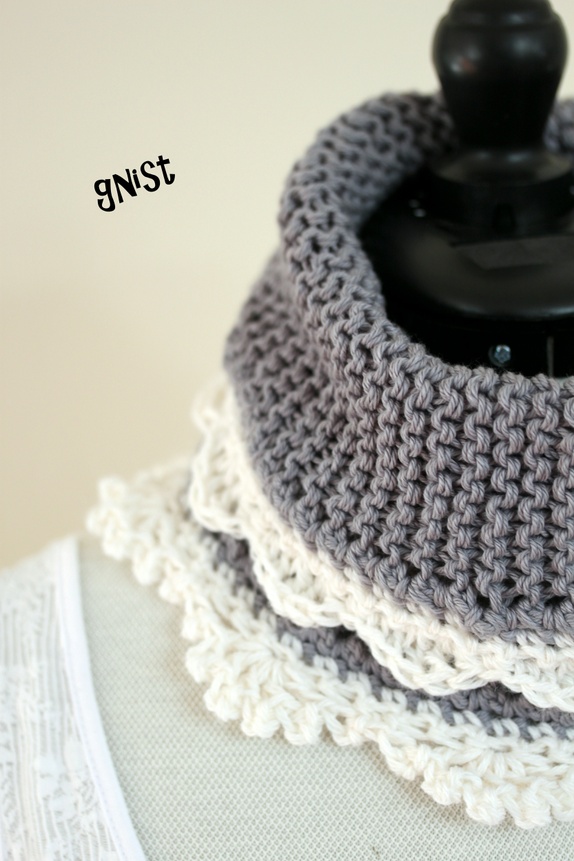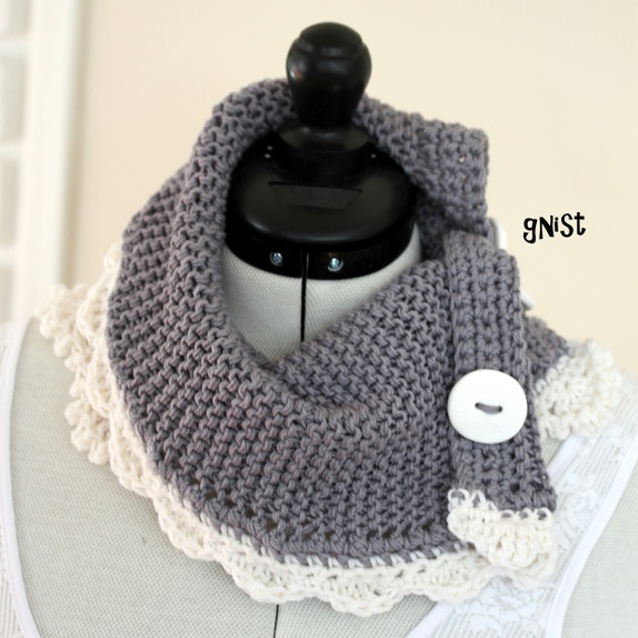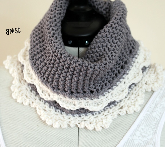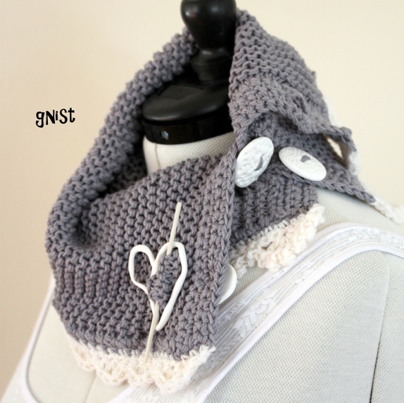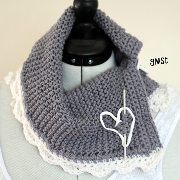 Med to ulike heklede kanter i hvitt alpakkagarn. Feminin, anvendelig og ikke for varm.