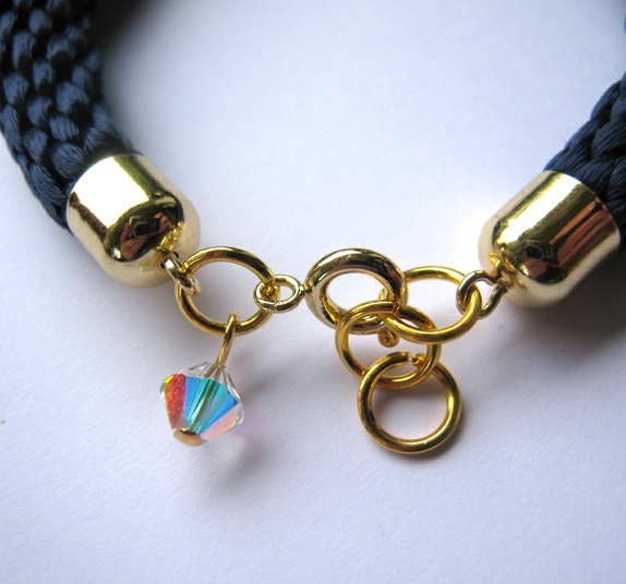 Armbånd i flettet 1 mm satengsnor med endestykker/ lås/ o-ringer i forgylt metall, swarovskikrystall ved låsen.