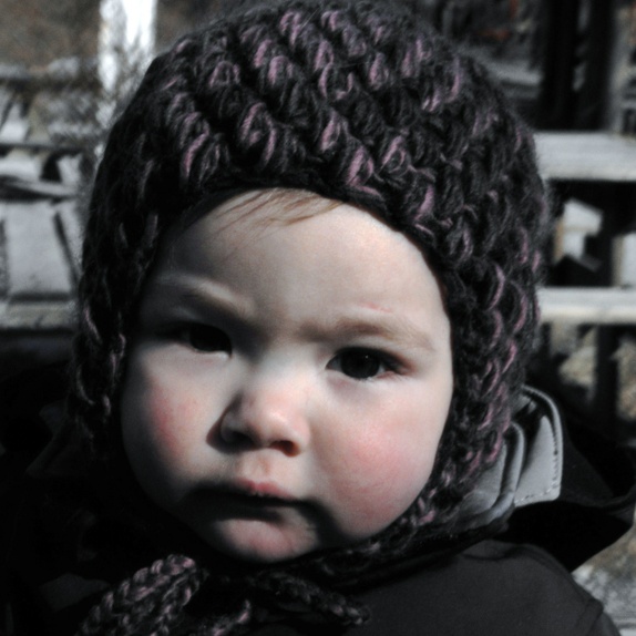 Lilla og svart-melert hekla knytehue i ei blanding av ull og akryl, med knyting.