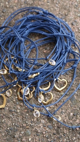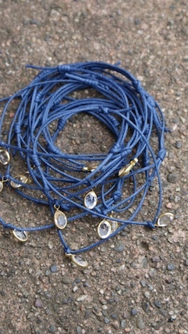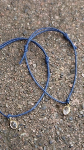 Flott og vakker blå vokset bomullsnor. Med en dråpeformet vintage glass "diamant" som er rammet inn av messing. Måler ca 1x 0.6 cm.