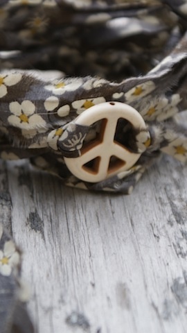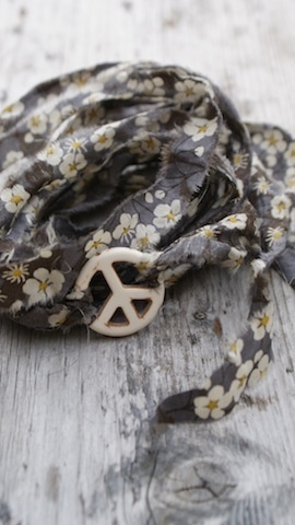 Peace tegn av sten som måler 2,5cm i diameter. Med revet Liberty stoff som ligger dobbelt og måler da ca 68cm hver.