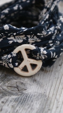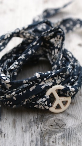 Peace tegn av sten som måler 2,5cm i diameter. Med revet Liberty stoff som ligger dobbelt og måler da ca 68cm hver.