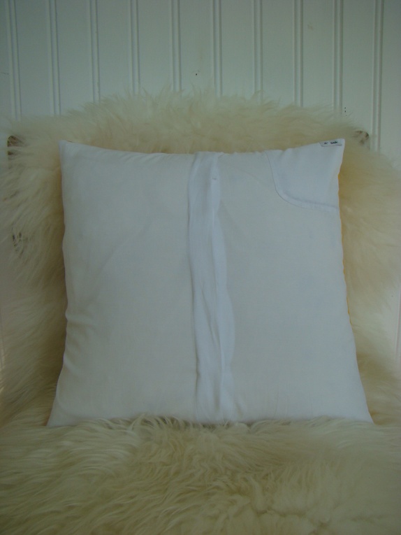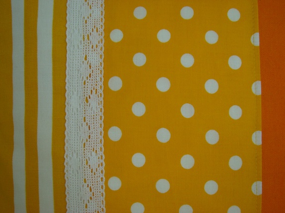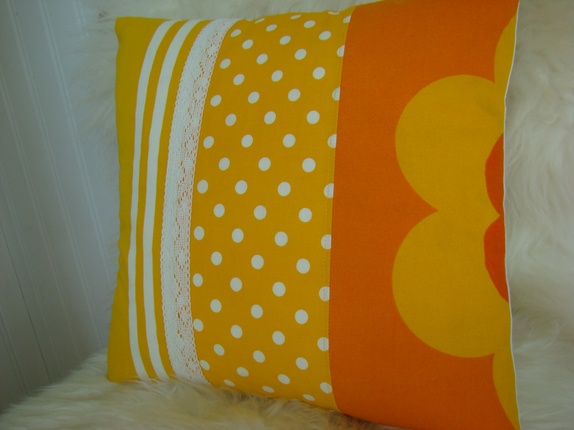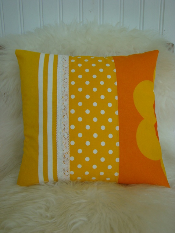 Putetrekk satt sammen av 3 vintagestoffer. Ett gult med hvite striper. Det andre er gult med en oransje blomst, og det siste er gult med hvite polkadotter. Alle er i kraftig bomull. Tilslutt er den pyntet med heklet blondebånd fra mormors syskrin. Bakside er laget av en gjenbrukt hvit skjorte i viscose. Knappeåpning.