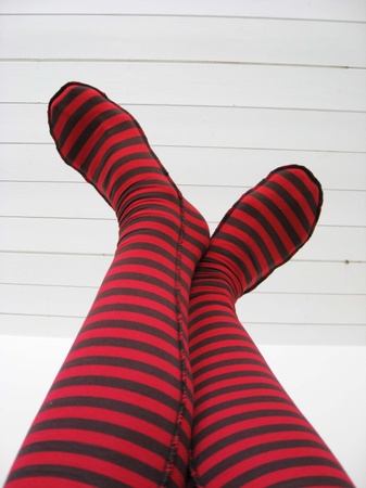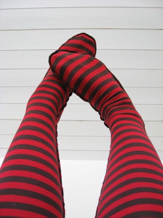 Lange, deilige knestrømper som rekker til godt over knærne. De er sydd i stripete bomullsjersey i brunt og rødt. Knestrømpene er fasongsydd med en dekorativ overlocksøm på utsiden.