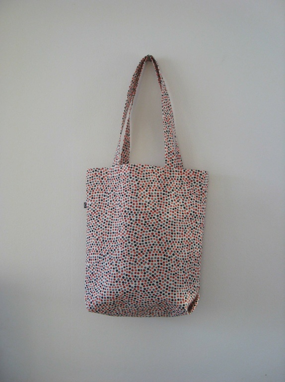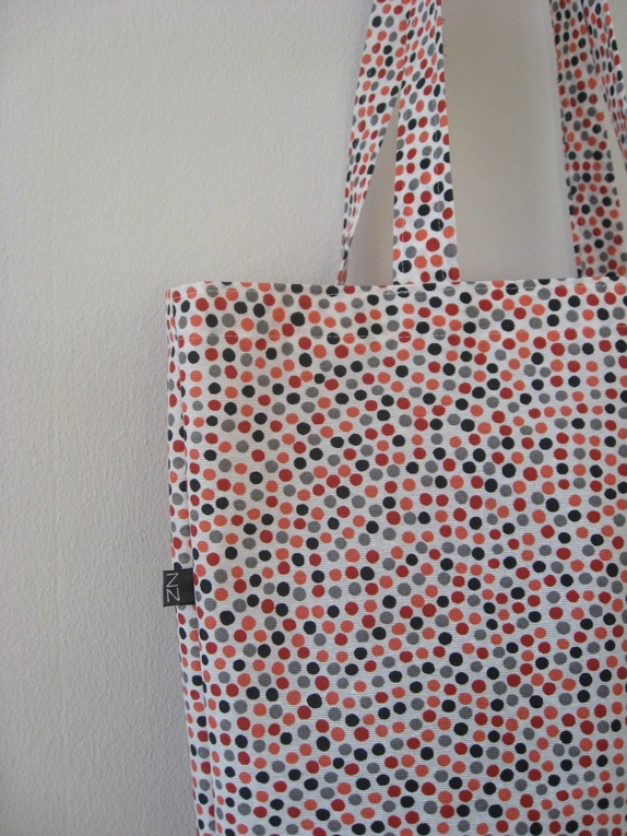 Fint og praktisk nett til handleturen, treningstøy eller andre små og store saker. Nettet er sydd i et kraftig bomullsmateriale, pvc-belagt, i offwhite/beige med et mylder av små prikker i oransje, rustrødt, sort og grått.