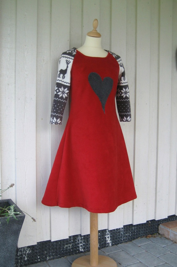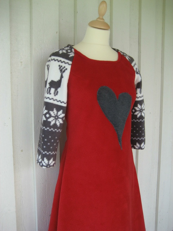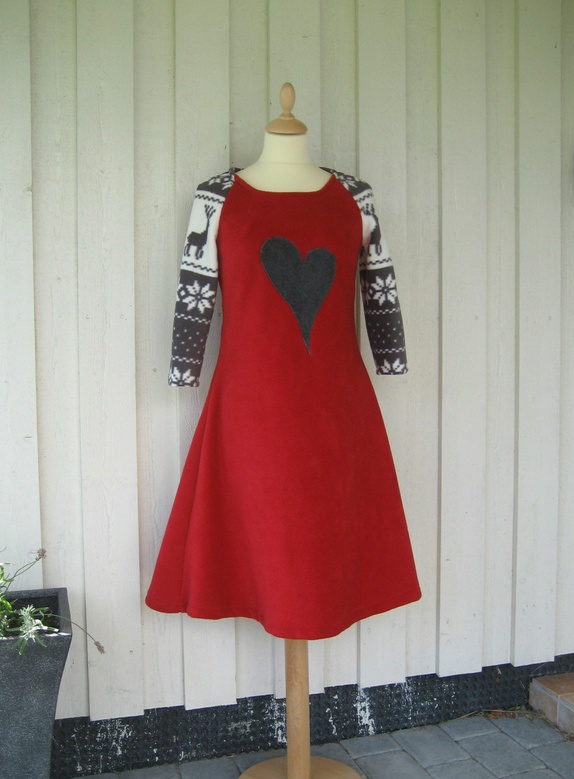 Flott kjole sydd i mørk rød polar fleece og polarfleece med reinsdyr. Kjolen er pyntet med et stort hjerte i koksgrå fleece.