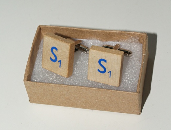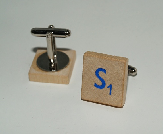 Mansjettknapper laget av Scrabble brikker i tre med blått trykk med bokstaven S.