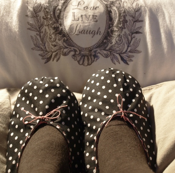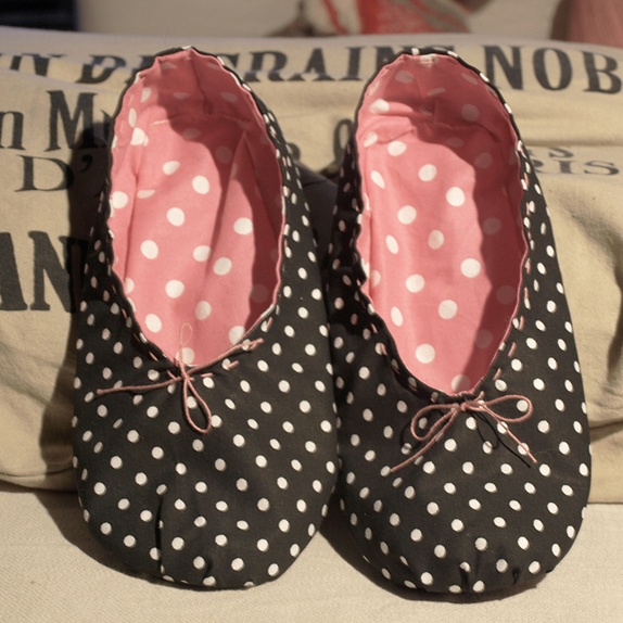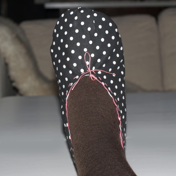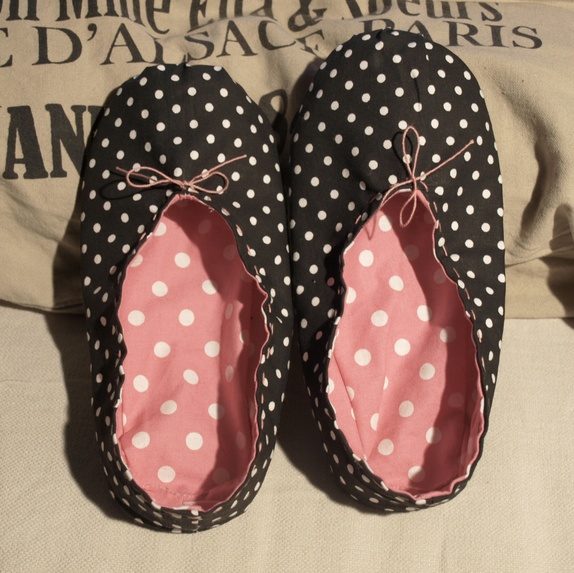 Disse supersøte inneskoene ( tøfler)er sydd i Panduro polkadot bomullstoff.Myk vatt mellom sålen.Passer str 37/38