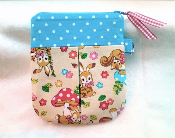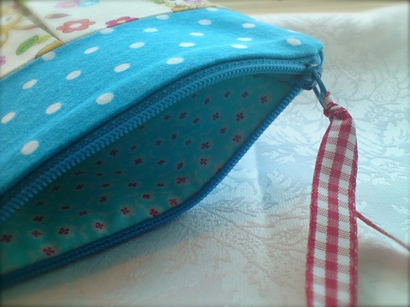 Nett liten pung sydd i japansk bomull og turkis bomull med hvite prikker. Lukkes med glidelås.