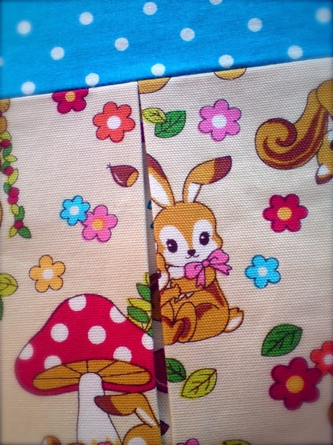 Foret med stoff i turkis, rød og hvit småmønstret.