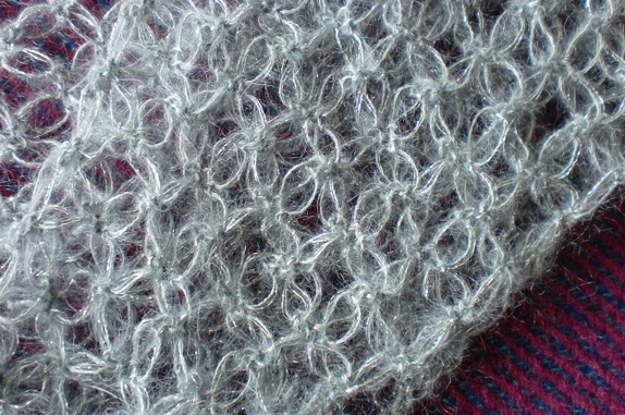 Mål: 123 cm br., 77 cm h.Garn: Kid silk mohairTeknikk: Englemasker, Sølvtråd er heklet inn.