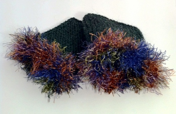 Pulsvantene er håndlaget i mørk grått ullgarn med pyntekant av effektgarn i mange farger, noe som gjør at de matcher og kan brukes sammen med mye av det du har i garderoben. De pynter diskret opp et mørkt antrekk også!