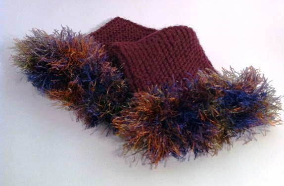Pulsvantene er håndlaget i burgunder ullgarn med pyntekant av effektgarn i samme farge, men en nyanse mørkere.