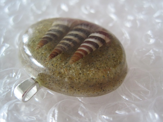 Små skjell på ei strand av sand er støpt inn i epoksy. Dette anhenget er støpt i tre omganger. Sanda kommer fra stranda i Bournemouth England.