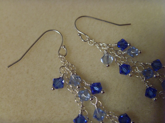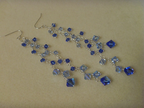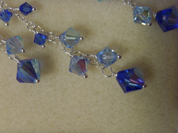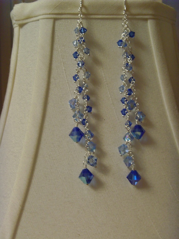 10 cm lange øredobber med swarovski bicone krystaller i fargene sapphire og light sapphire. Krystallene er 4, 6 og 8 mm store. 6 og 8 mm har AB finish, som gjør at de glitrer ekstra mye.