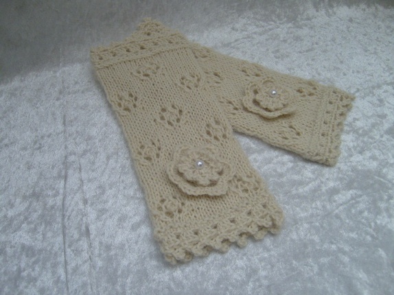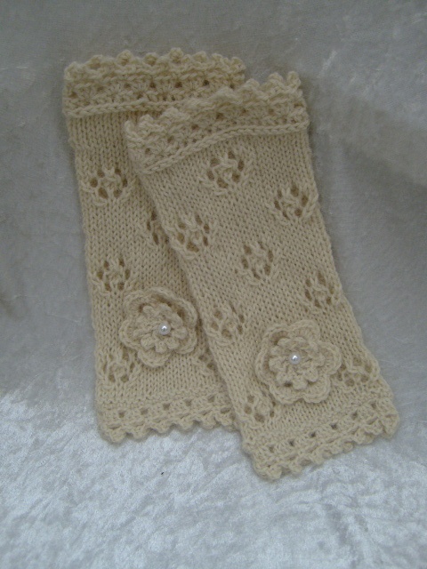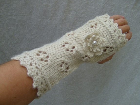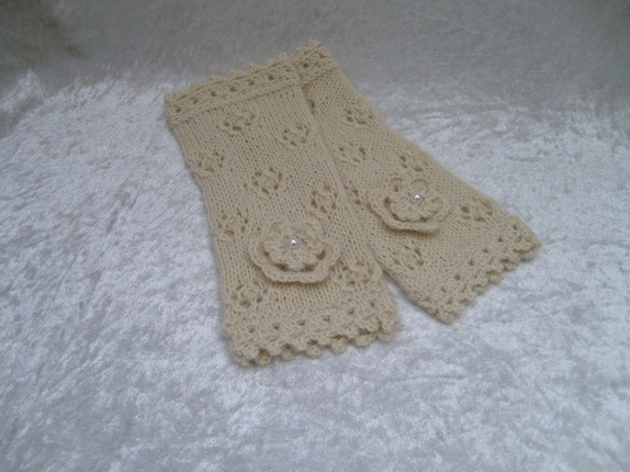 Gode og varme naturhvite pulsvanter som er strikket i et nydelig blondemønster og med hekla kanter.Til pynt er det festet på en skjønn heklet blomst med hvit perle i midten. Pulsvantene har hull til tommelfinger.