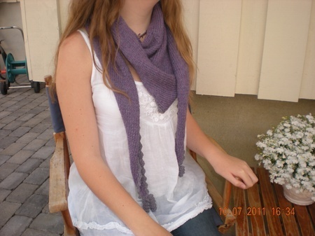 Strikket i lilla/fiolett mix og pyntet med lilla/grå mix...
