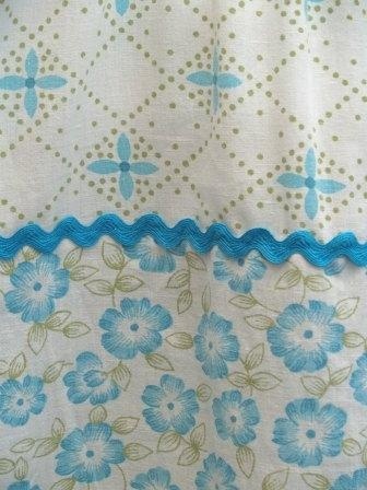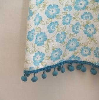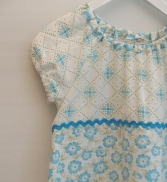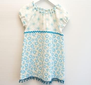 Søt rynkekjole i lett bomullsstoff. Sydd av mykt sengetøy. Hvit bunnfarge med mønster i turkis. Pyntet med en turkis kroklisse og turkis pongpongbånd. Korte puffarmer. Strikk i hals og armer.