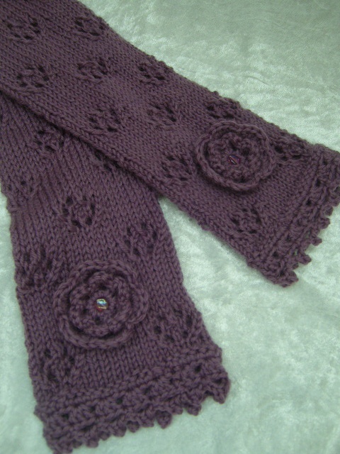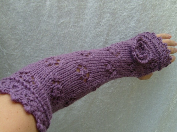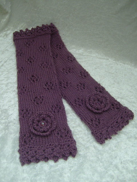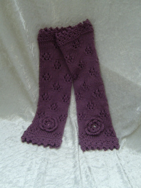 Gode og varme pulsvanrmere som er strikket i en skjønn mørk lyngfarge i et nydelig blondemønster og med pyntekanter som er heklet. Til pynt er det festet på en nydelig heklet blomst med glassperle i midten.