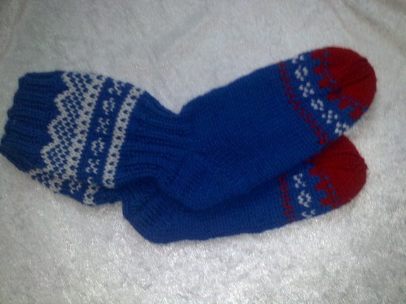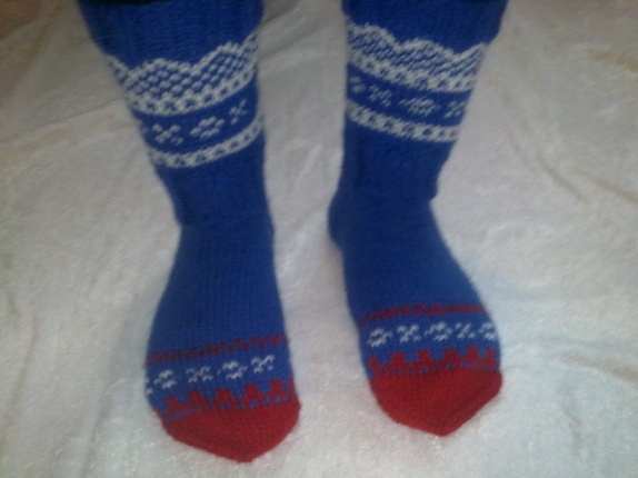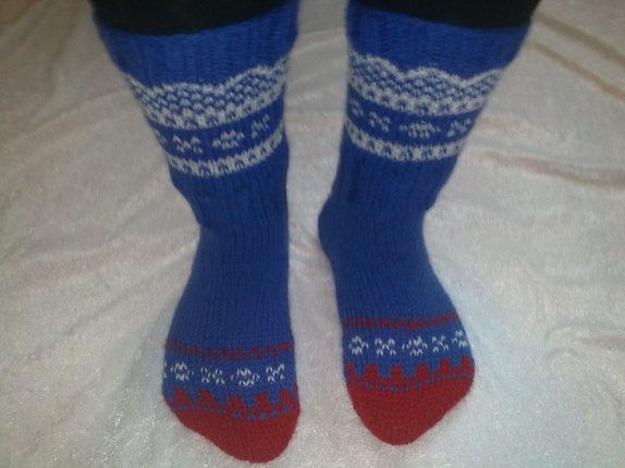 Kjempegode Marius inspirerte ullsokker strikket i superwashullgarn. farger: mellomblå, rød og hvit.