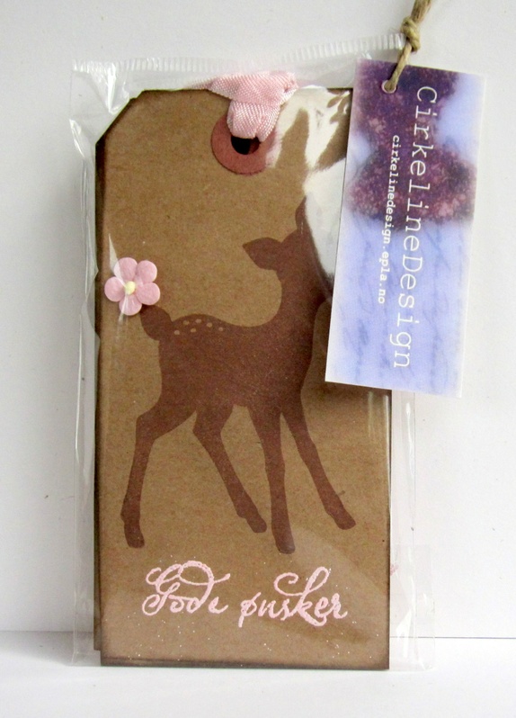 Lappene er håndstemplet med yndige Bambi i sjokoladebrunt. Hun har rosa blomst på halen. "Gode ønsker" er embosset (forhøyet) i rosa. Kantene er svertet for en "vintage look". På baksiden er det stemplet "Til" og "Fra", og det er plass til en personlig hilsen. Rosa sløyfebånd hører med.