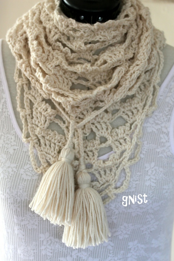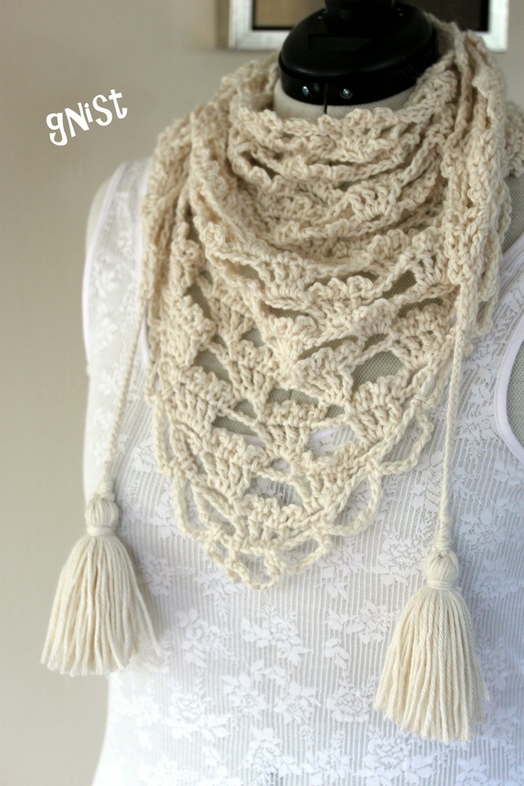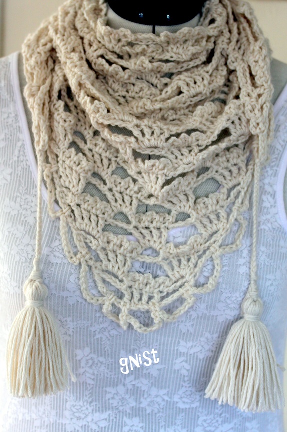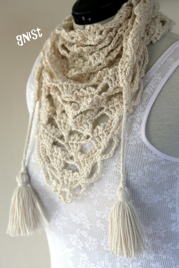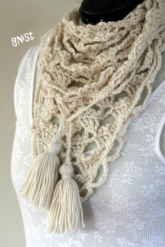 Offwhite trekant-skjerf. Knytes som skjerf eller brukes som et lite sjal. Med fletter og dusker i endene for knyting og pynt.