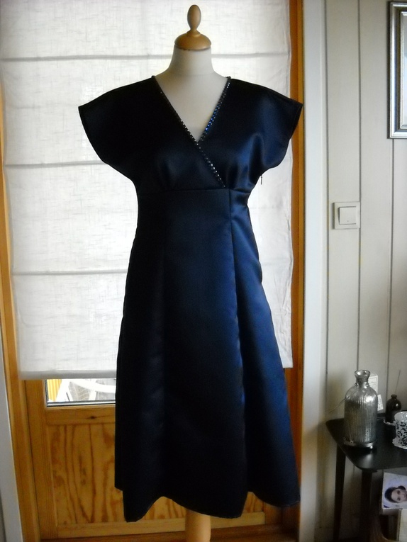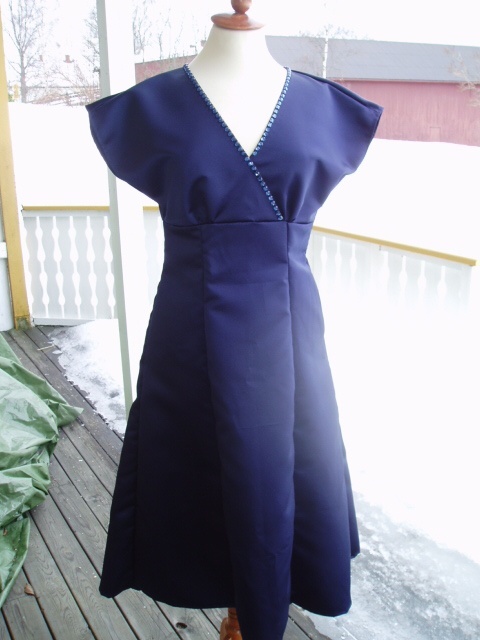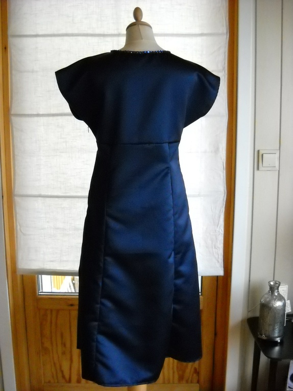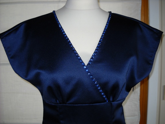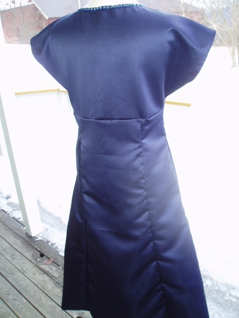 Mørk blå, knelang kjole i tykk (litt varm), blank sateng, 100% polyester. Pyntet med strass rundt hele halslinningen. Man kan ha en underkjole under. Størrelse 38.