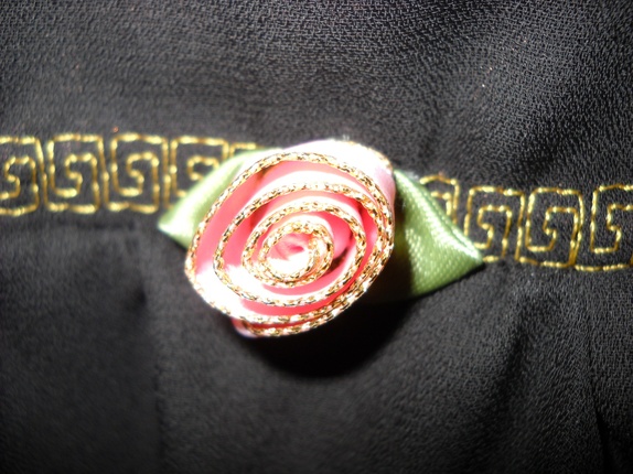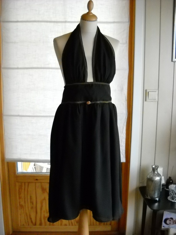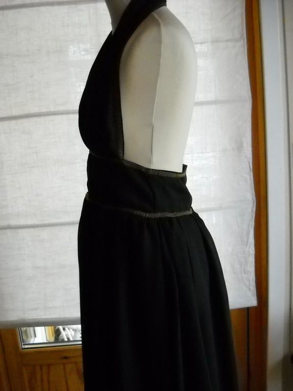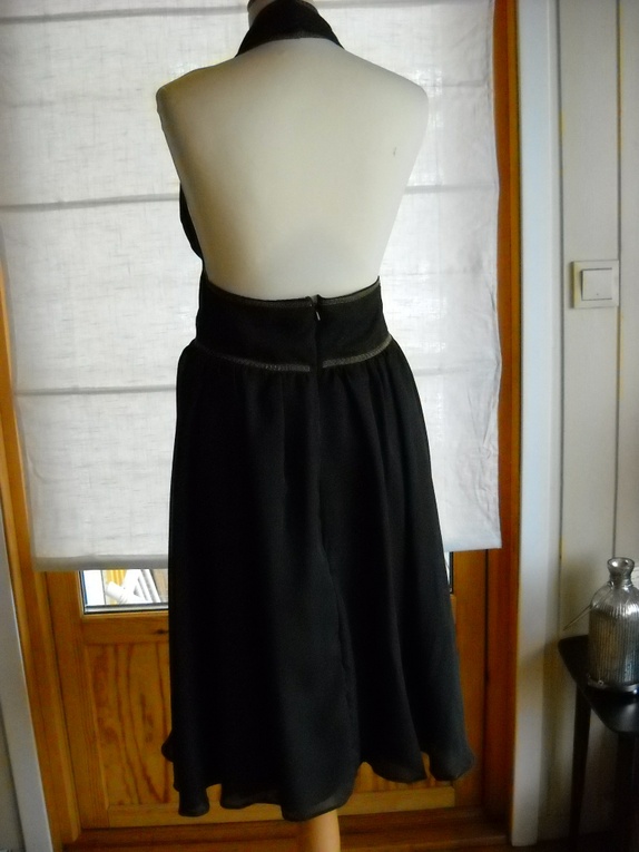 Mørk brun chiffonkjole, pyntet med gullsømmer og en rose. Foret. Sexy utringning, og veldig dyp bak. 100% polyester. Størrelse 36/38.