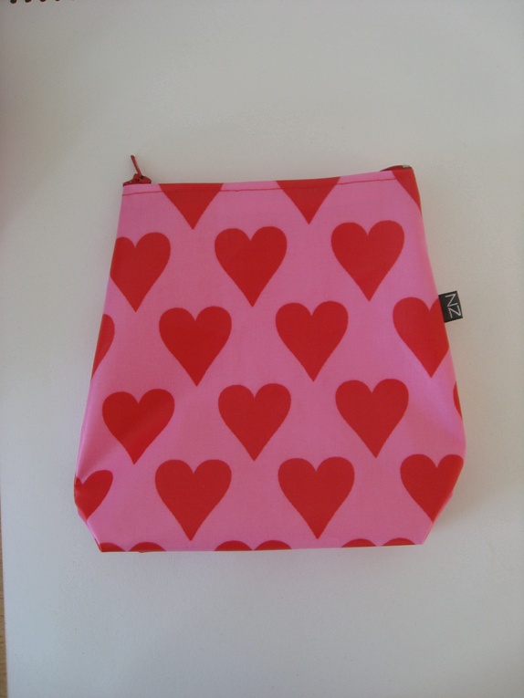 Mellomstor pung i knallrosa med store røde hjerter. Her er det plass til litt sminke, smykker og andre hemligheter?