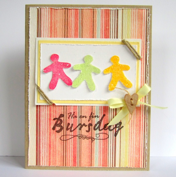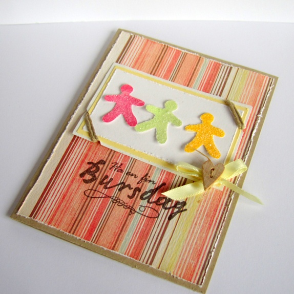 Det er pyntet med vakkert mønsterpapir og små "seigmenn", som er påført gjennomsiktig glassglitter, som er til forveksling lik sukkerstrø. En sløyfe på siden har en søt, liten treknapp i midten. "Ha en fin bursdag" er håndstemplet i sjokoladebrunt.