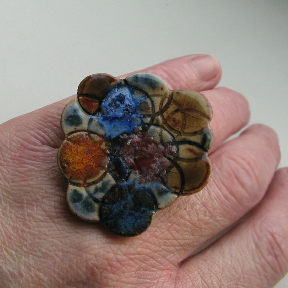 Stor keramikkring med sirkelmønster i mange ulike farger (blå, brun, brungrønn, oransje, mørkerød). Ingen glasur på baksiden (brun leire med mørkebrune spetter).