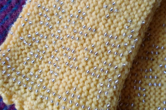 Gul pulsvarmer (nr 12) strikket i Dale babygarn med sølvperler og heklet kant mot håndleddet.