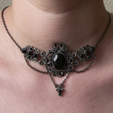 Lucious is a delicate and elaborated choker/necklace made in filigree style with antique pewter settings and adornments of jet black beads and stones.