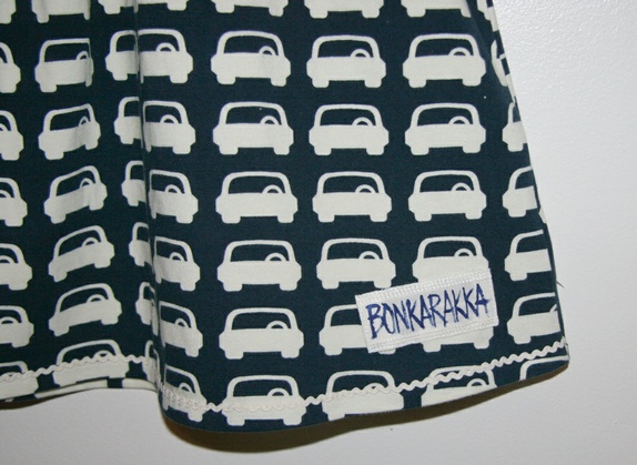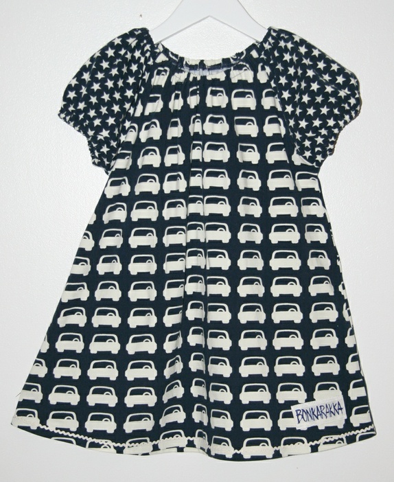 Kjole med biler og stjerner. Marineblå og krem. Deilig jersey.