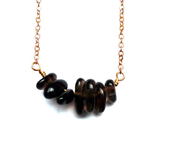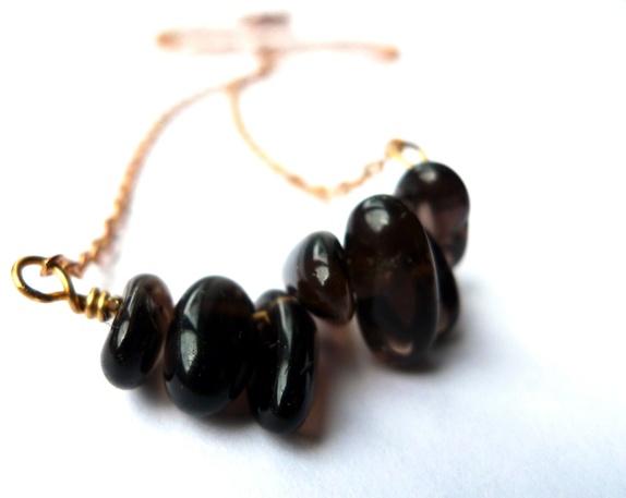 Smykke med organisk formede perler av naturlig røykkvarts.