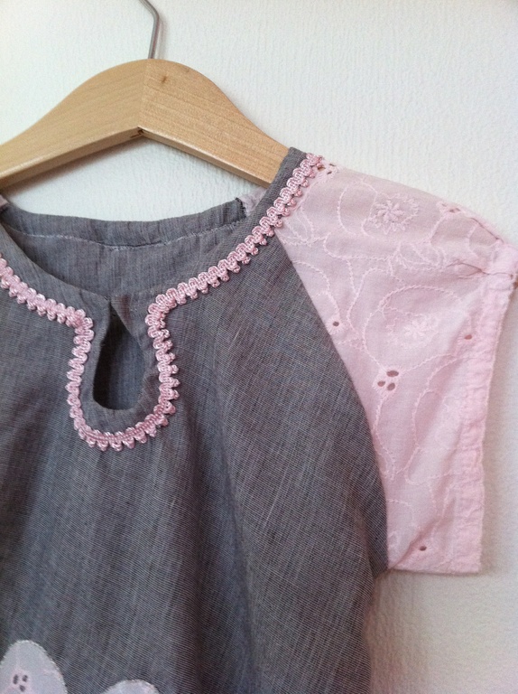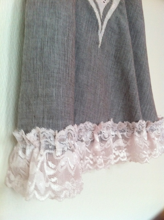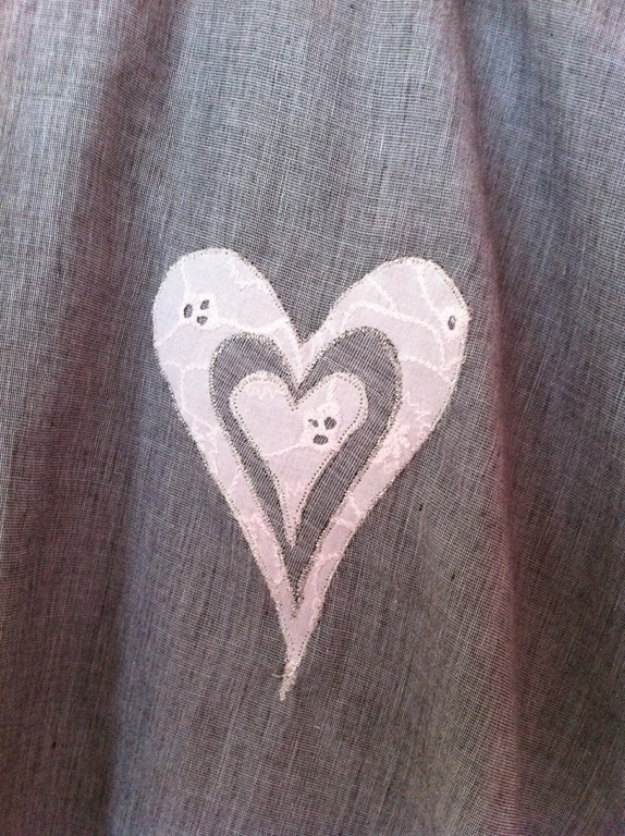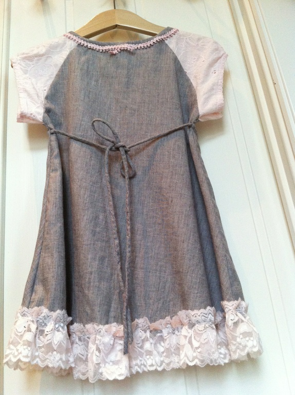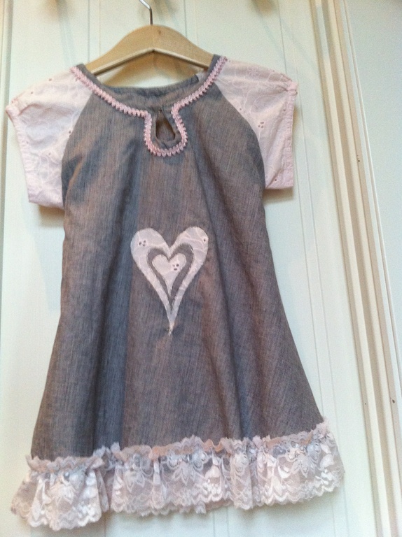 Redesign kjole str. 1- 2 år, raglan ermer. Applikert hjerte og påsydd blonde. Knytting bak.Bomull.