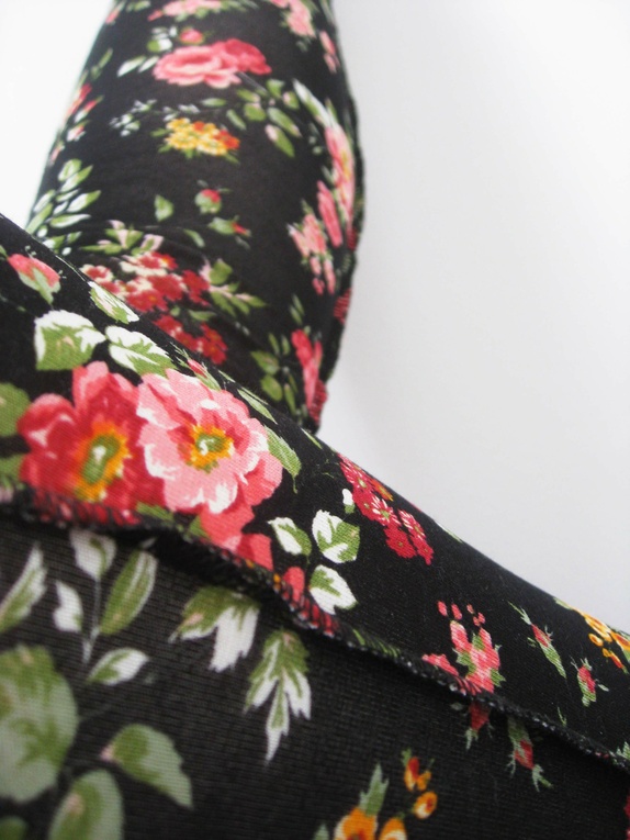 Lange, deilige knestrømper som rekker til godt over knærne. De er sydd i en mønstrete viscosejersey. Sorte strømper med rosa, hvite og gule roser og grønne blader. Knestrømpene er fasongsydd med en dekorativ overlocksøm på utsiden.