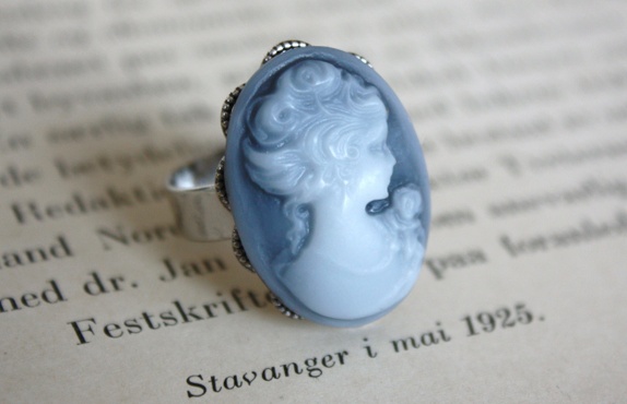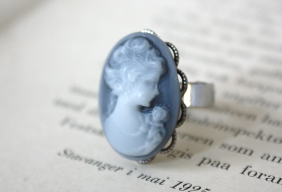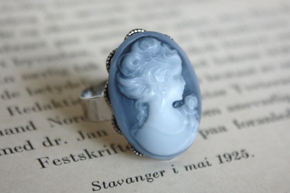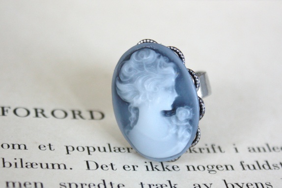 Nydelig ring med blågrå og hvit cameo på sølv filigramsramme. Ringen kan justeres til ønsket størrelse.