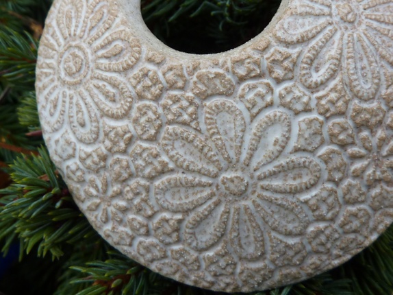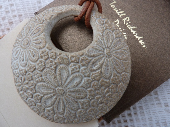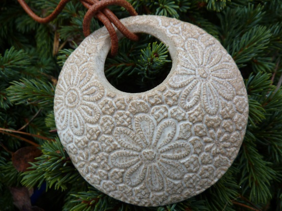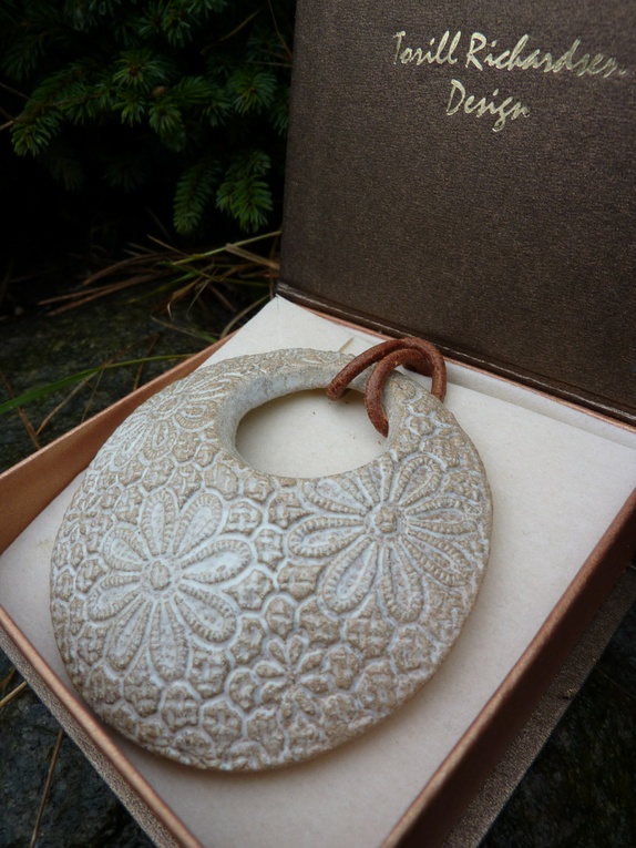 Halssmykke er laget av leirgods og har en diameter på så 6 cm.Den hvite tynne glasuren viser noe av den lyse brune leiren. En fin kombinasjon.Brun lærsnor med regulerbar knute.Gaveeske følger med.