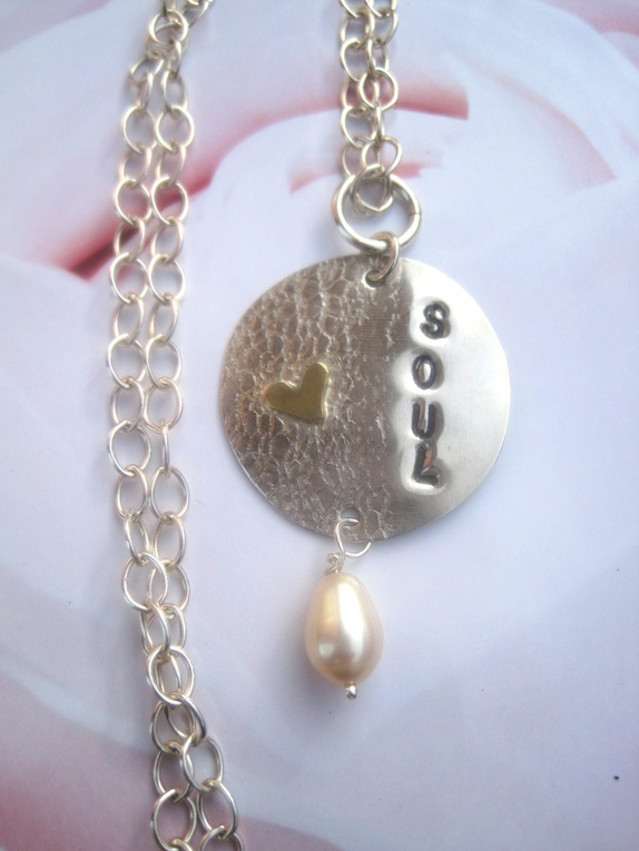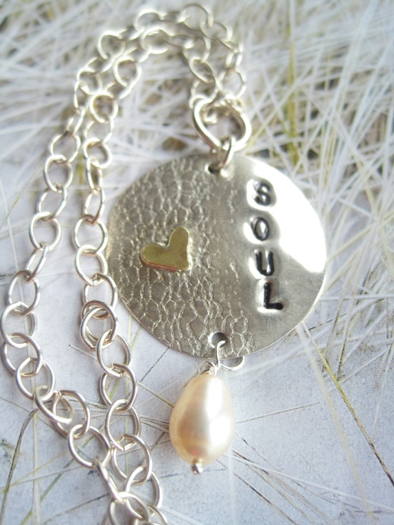 Håndsaget og preget anheng i sterling sølv med stor vaniljefarget ferskvannsperle. Lite hjerte i messing.