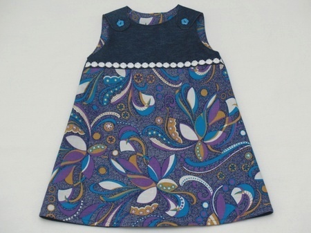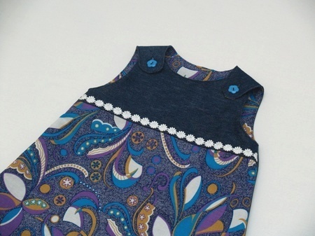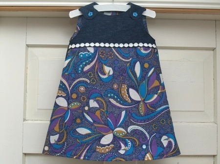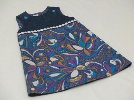 Fargerik hengslekjole med god passform som barnet kan vokse i. Sydd av en gjenbrukt dongeribukse og multifarget retro skjørt i ren bomull. Kjolens overdel er foret med det samme stoffet som utgjør forstykkets underdel. Pyntet med et hvitt blomsterbånd over brystet og søte, lyseblå knapper. Kjolens bakstykke er i ensfarget, blått dongeristoff.