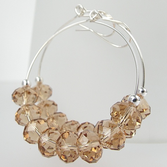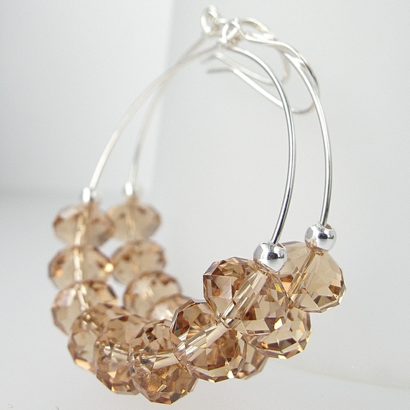 Øreringer i sølv, med krystaller i en nydelig lys gyllenbrun farge. Den ser ikke like gyllen ut sammen med sølv som med gull, derfor kaller jeg den lysebrun her.
