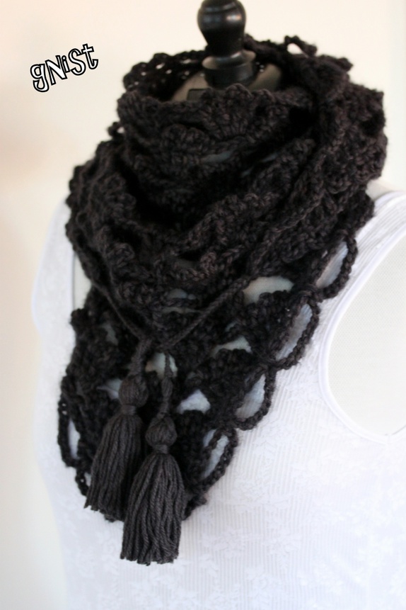 Trekant-skjerf i koksgrå/sort. Knytes som skjerf eller brukes som et lite sjal. Med fletter og dusker i endene for knyting og pynt.