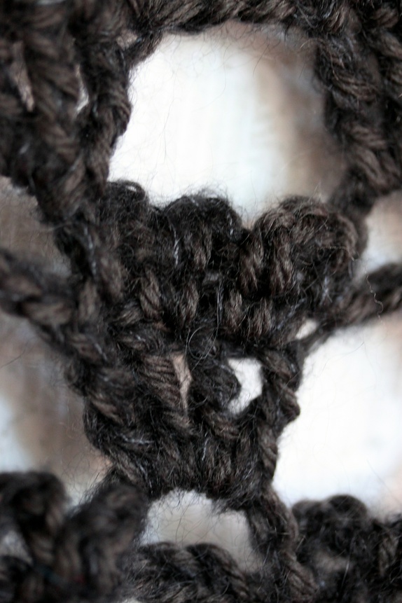 Heklet av en tråd koksgrått ullgarn og en gråsvart tråd med glans av sandnes silk mohair (60% kid mohair, 15% ull, 25% silke).