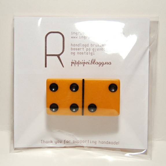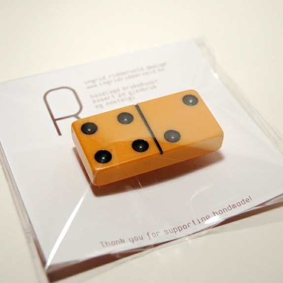 Enkel og autentisk brosje / pyntenål, laget av en vintage dominobrikke! Fin både på kjolen, jakka, lua eller veska. Noe som matcher mannens dominomansjettknapper kanskje? :-)